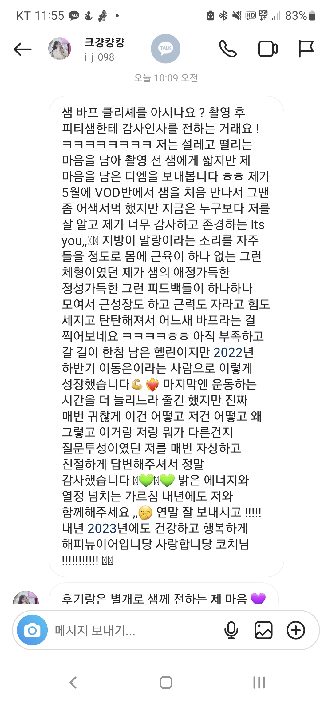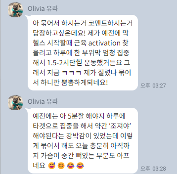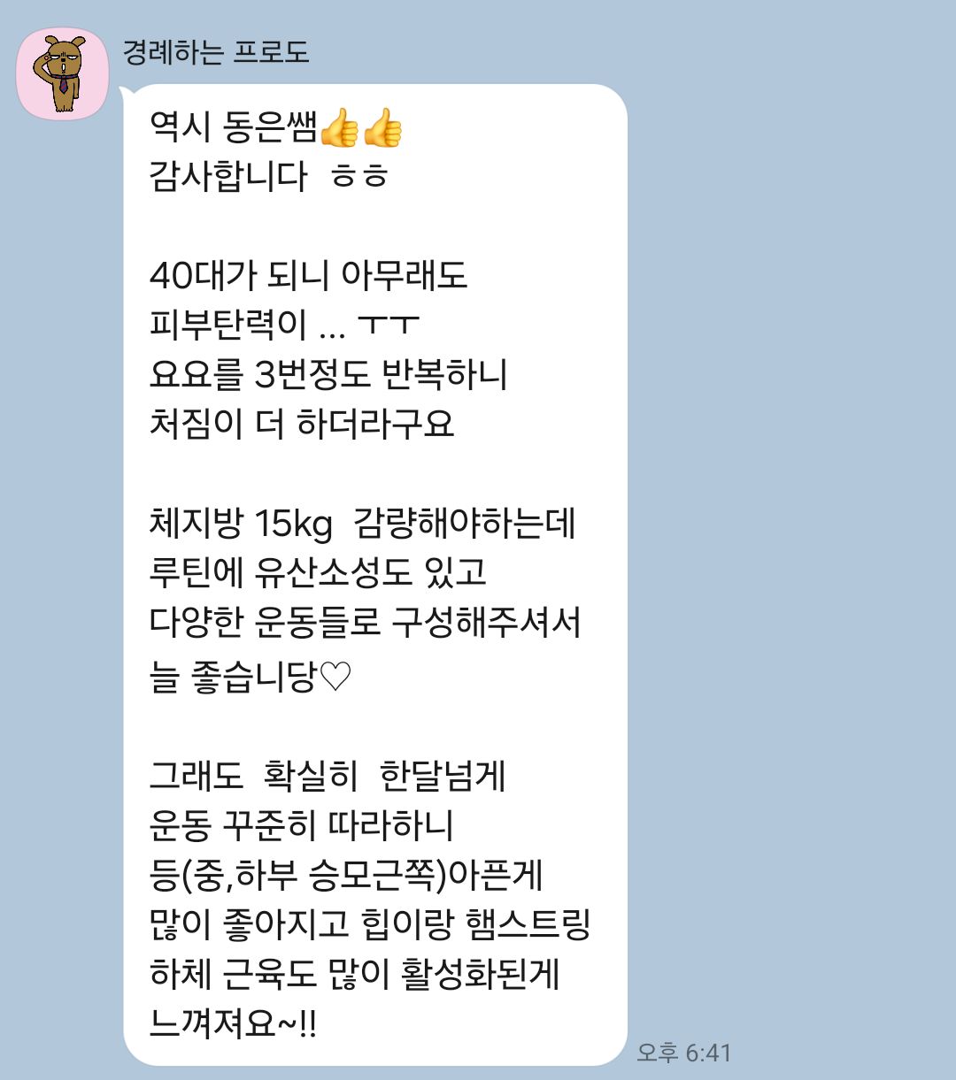수업이 종료된 후, 루틴을 공유드립니다. 개선사항도 간단히 정리드리며, 도움이 되는 운동은 영상으로도 공유드리고 있습니다. 개인톡으로 편히 소통하고 있어요 :)