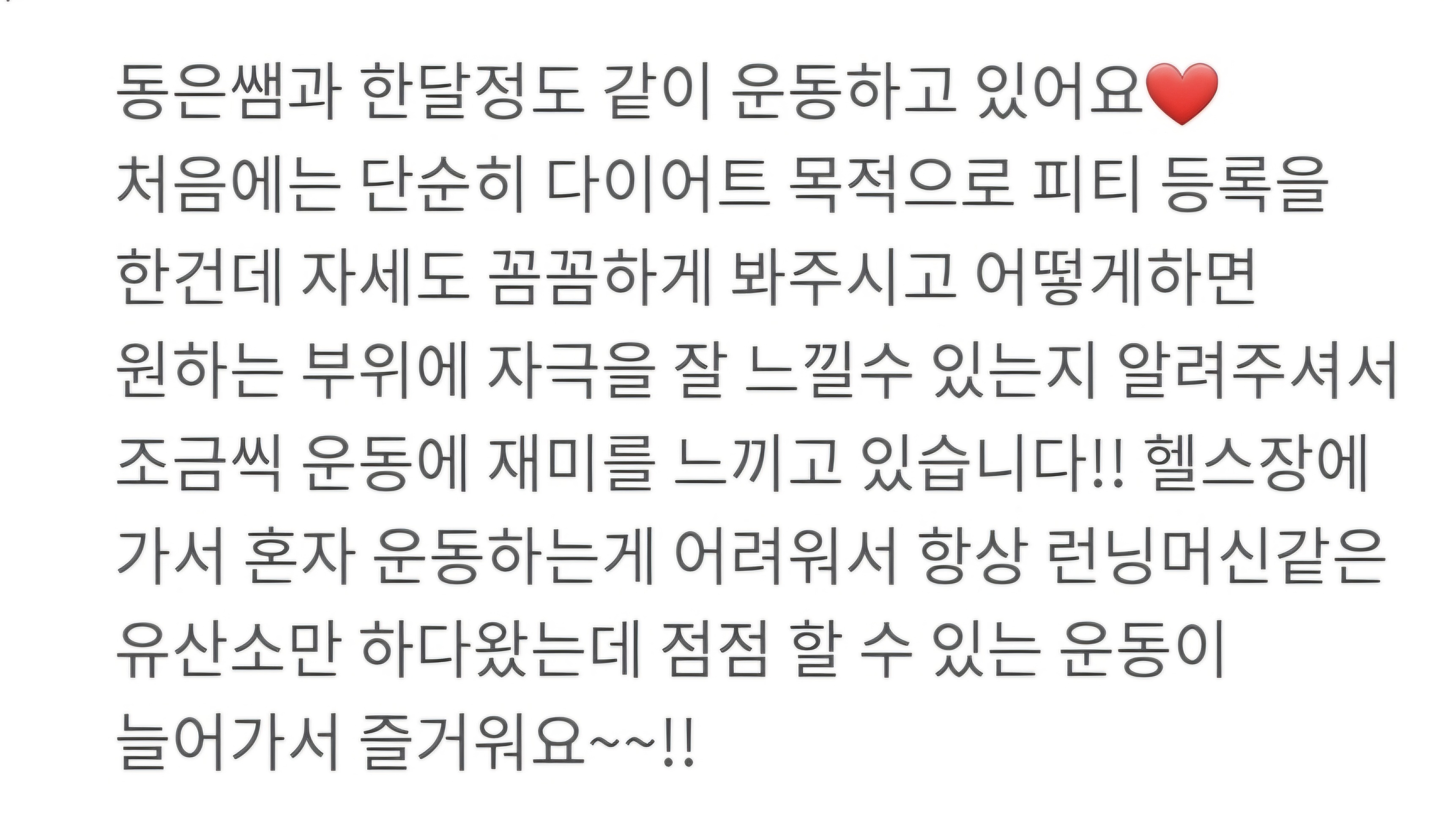 피티 수업 외에 개인 운동 빈도를 늘리면 더욱 빠른 목표 달성이 가능합니다.