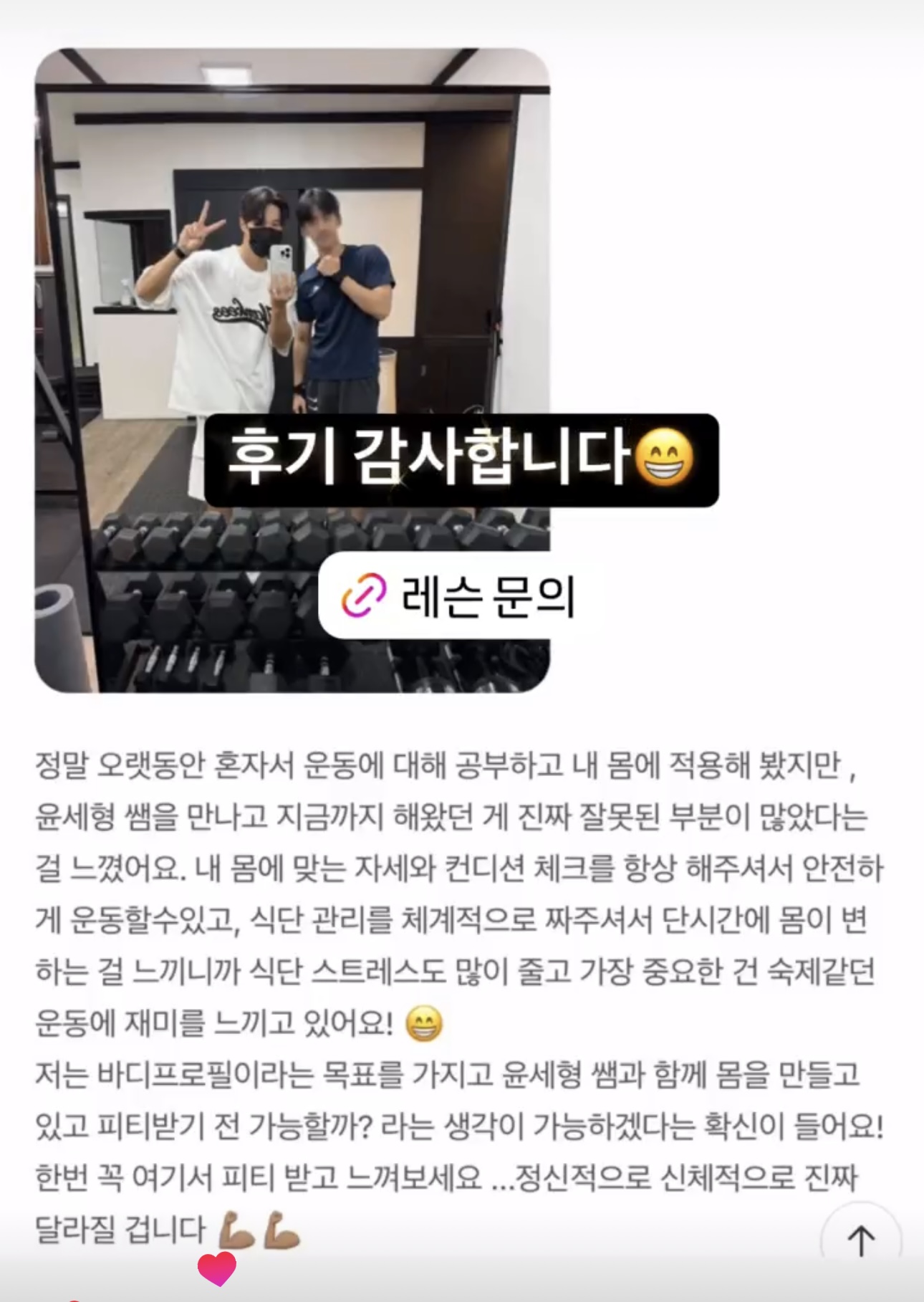 • 회원님들과의 소통을 중요시하며, 네이버 밴드 등을 활용해 운동 영상 공유와 일지 작성법을 지도하여 목표 달성을 위한 체계적인 환경을 제공합니다.