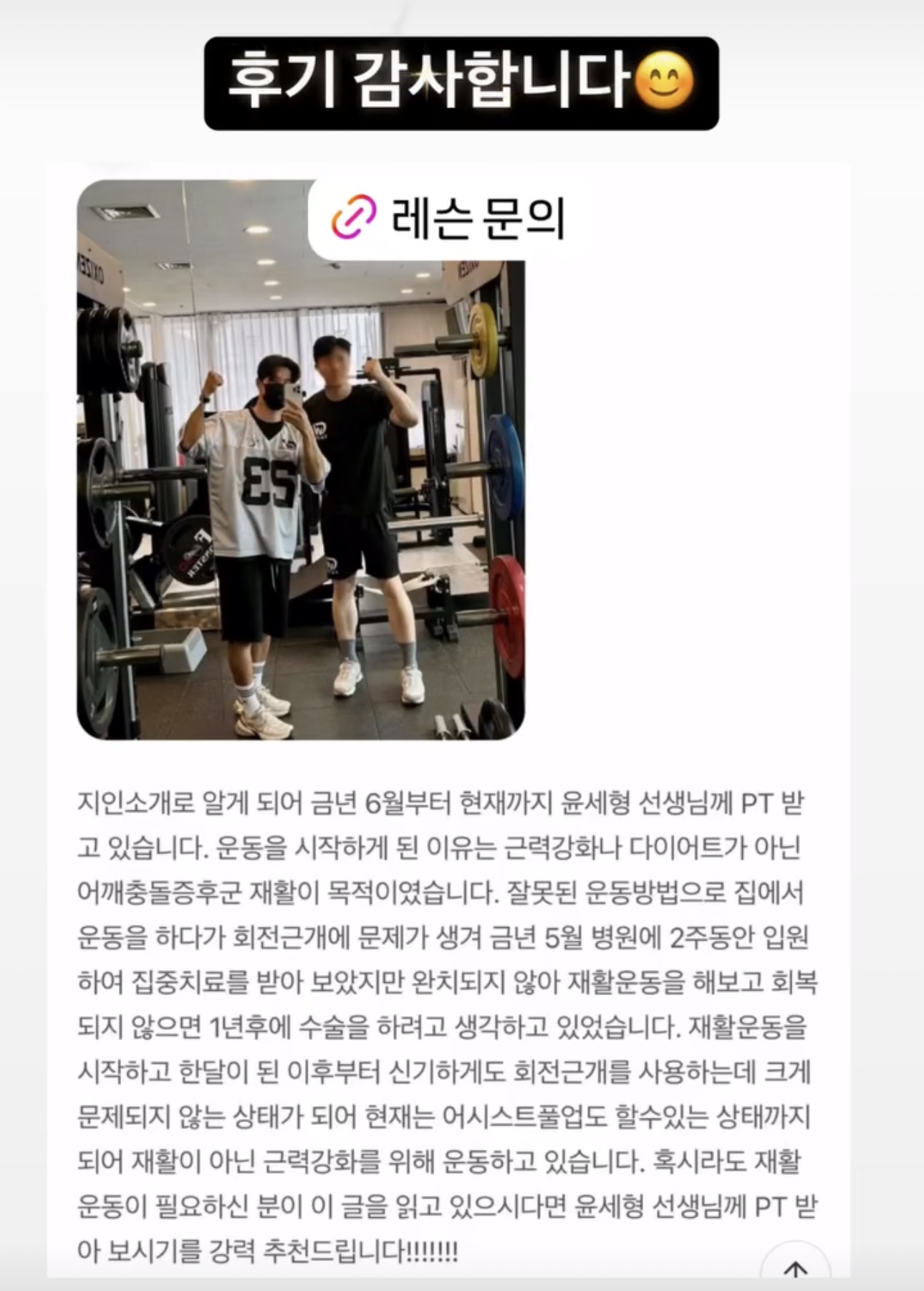 저는 회원님과의 소통을 가장 중요하게 생각합니다. 운동에 대한 어려움이나 고민이 있다면 언제든 이야기해주세요. 회원님들의 피드백을 기반으로 최적의 트레이닝 플랜을 설계하겠습니다.