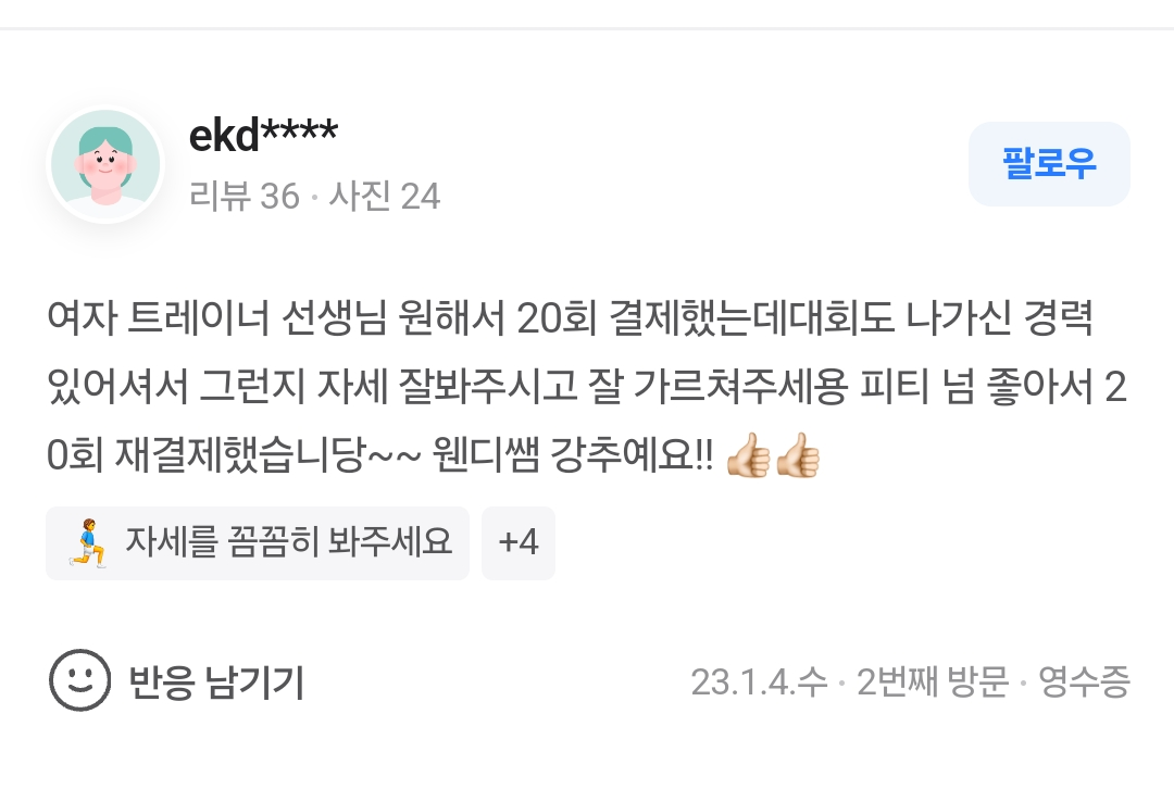 회원님들은 저의 이런 일관적인 텐션에서 편안함을 많이 느끼시기 때문에 저랑 운동하는 시간에 빨리 익숙해지신다고 하십니다.