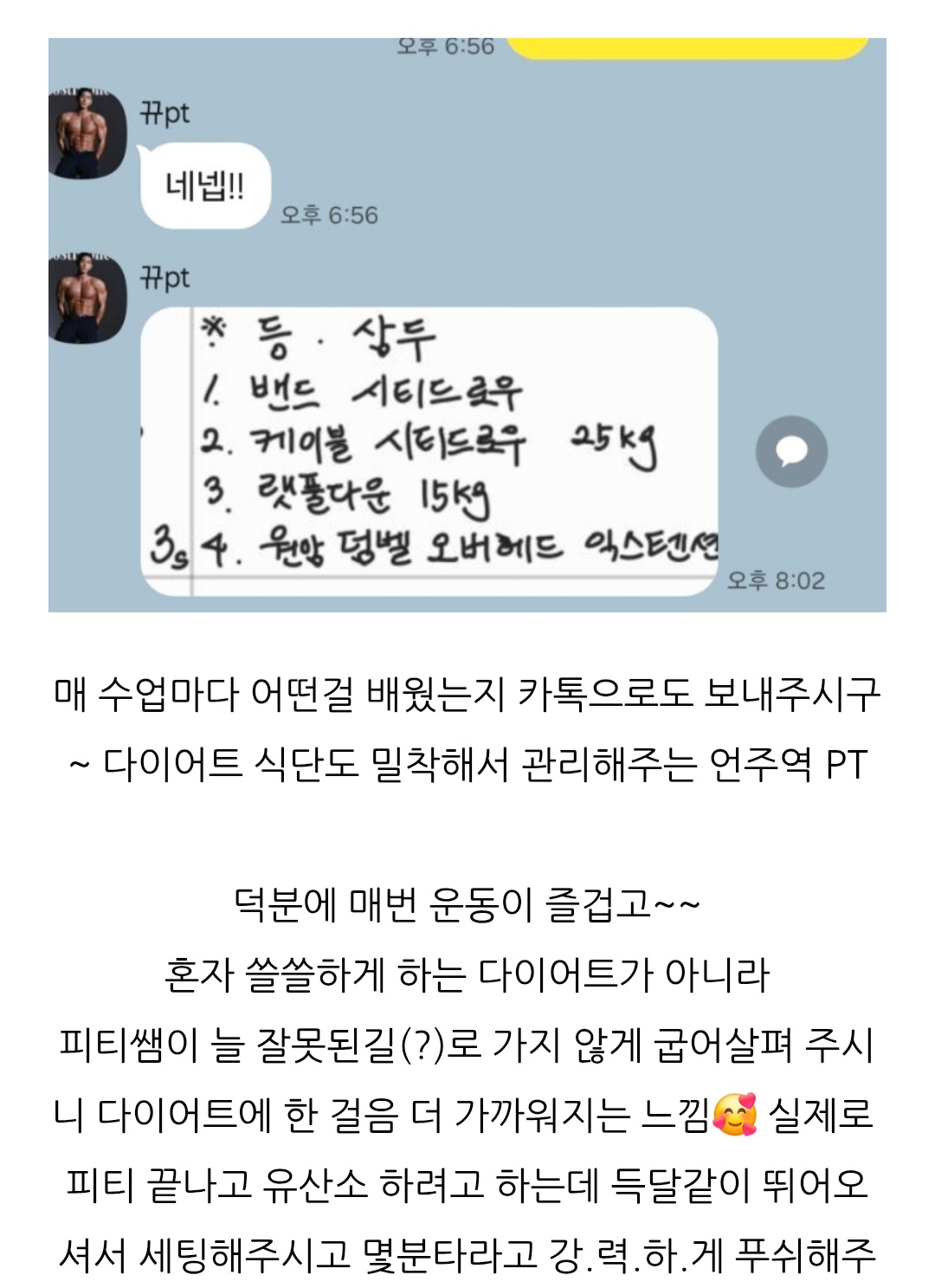 2. 개인 운동일지를 만들어 구체적인 부위 및 운동법을 체크하고 당일 피드백을 써서 수업당일 바로 전송 ➡️운동일지를 통해 스스로 보완과 연습 가능