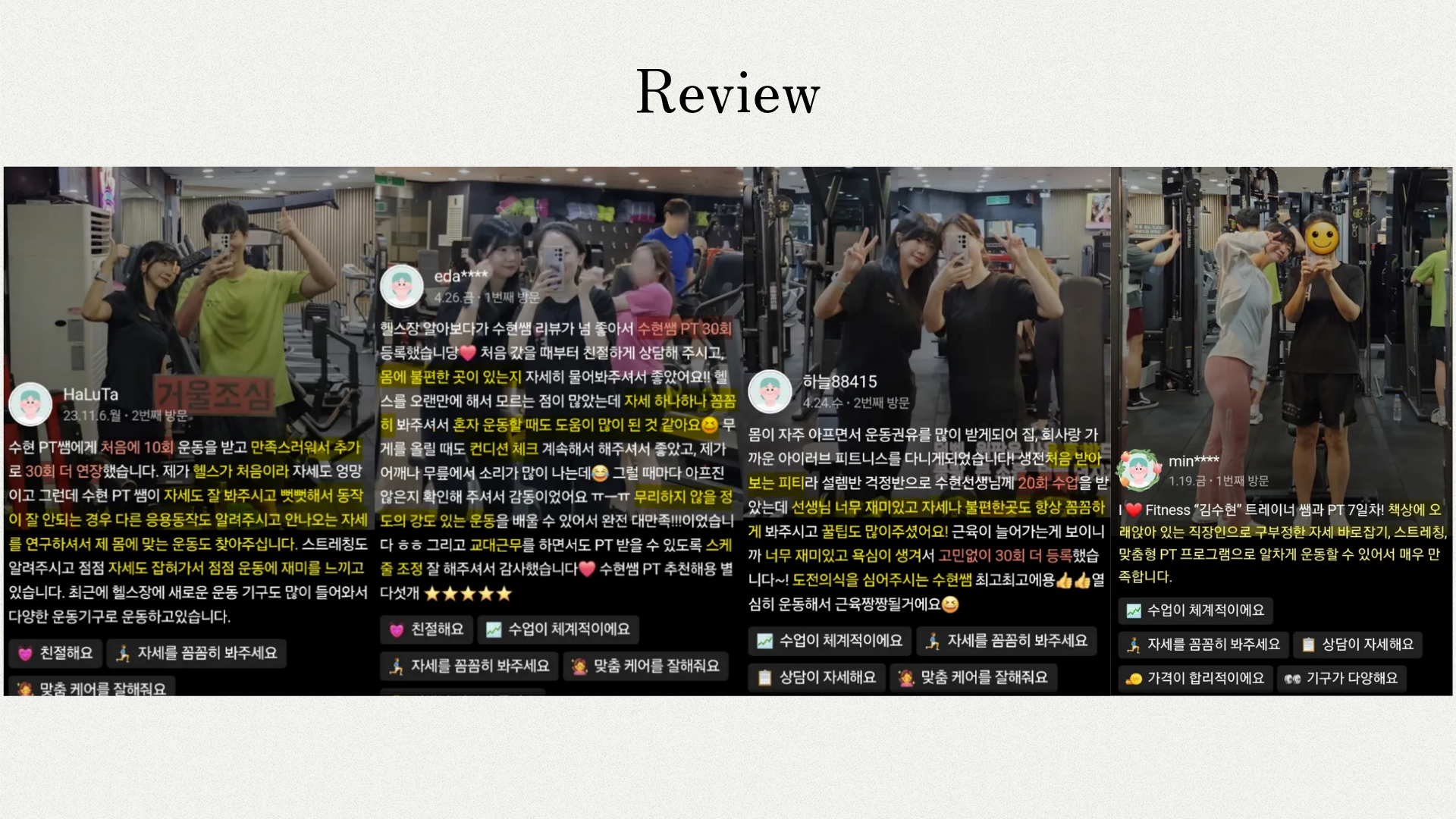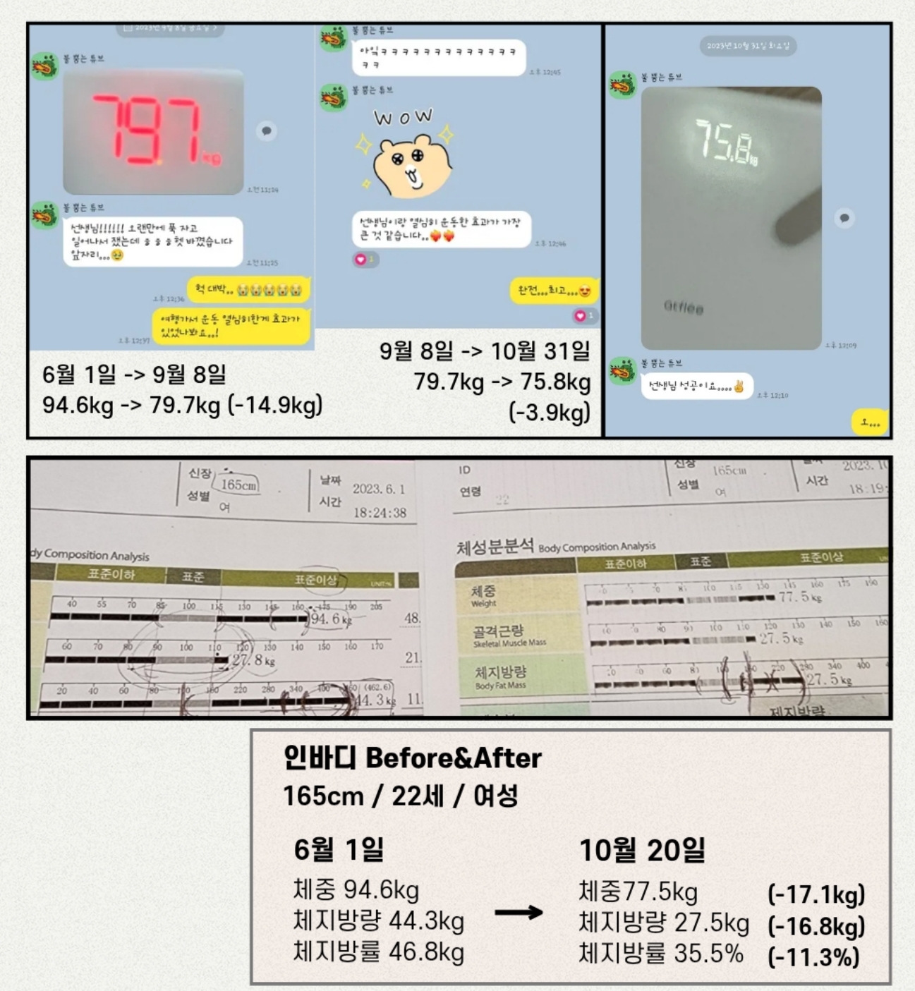 이 경험은 트레이너로서 회원님의 다이어트와 체형 변화뿐 아니라 호르몬의 변화, 컨디션, 심리적인 부분까지 고려한 더 섬세하고 현실적인 방향의 트레이닝을 할 수 있는 바탕이 되었습니다.