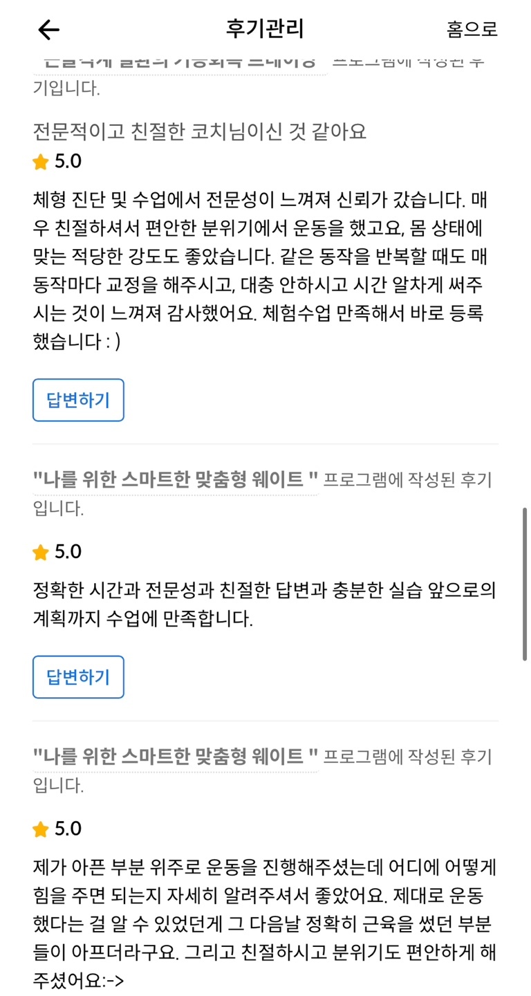 회원님께서 쏟은 노력과 시간을 결코 배신하지 않게끔, 좋은 결과가 함께할 수 있도록 옆에서 물심양면 서포트하겠습니다. 오랜 경험과 경력이 많은 저도 어떠한 부분에서는 부족함을 느낍니다. 모르는 것이 있다면 부끄러워 하지 않고 여전히 공부하고 교육을 들으면서 배우고 적용시키며 보완하는게 좋은 지도자라고 생각합니다.
