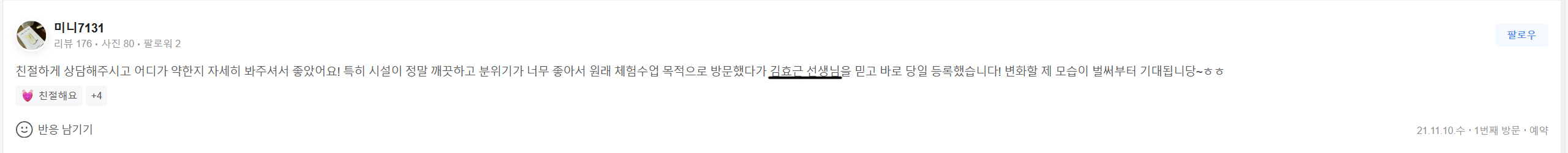 제가 그 무엇보다 좋아하는 운동을 알려주고, 그것으로 인해서 긍정적으로 변화하는 한 사람을 보는 것은 너무나도 행복하고 즐거운 일이었기 때문에 직업으로 트레이너를 선택하게 되었습니다.