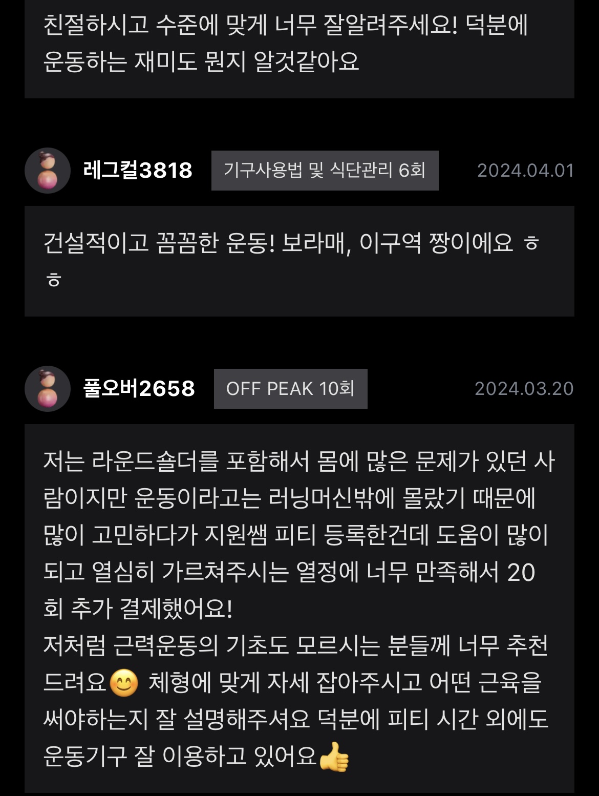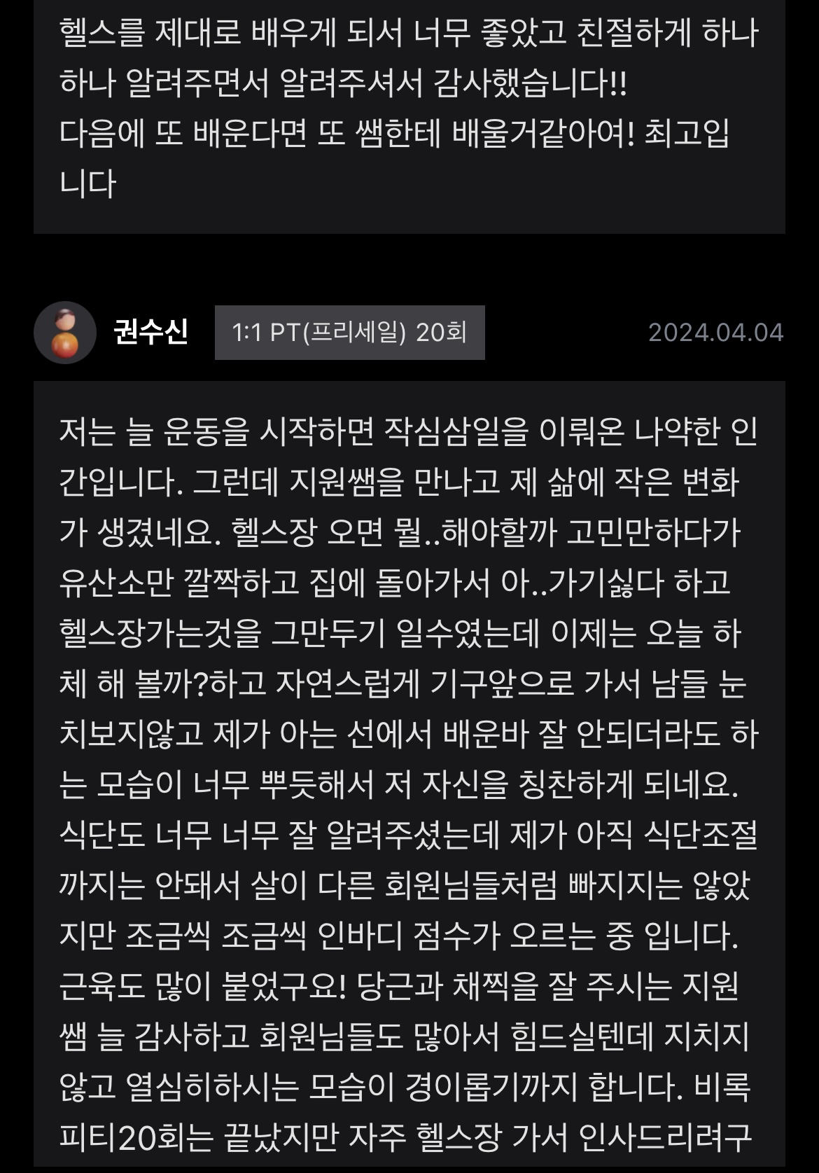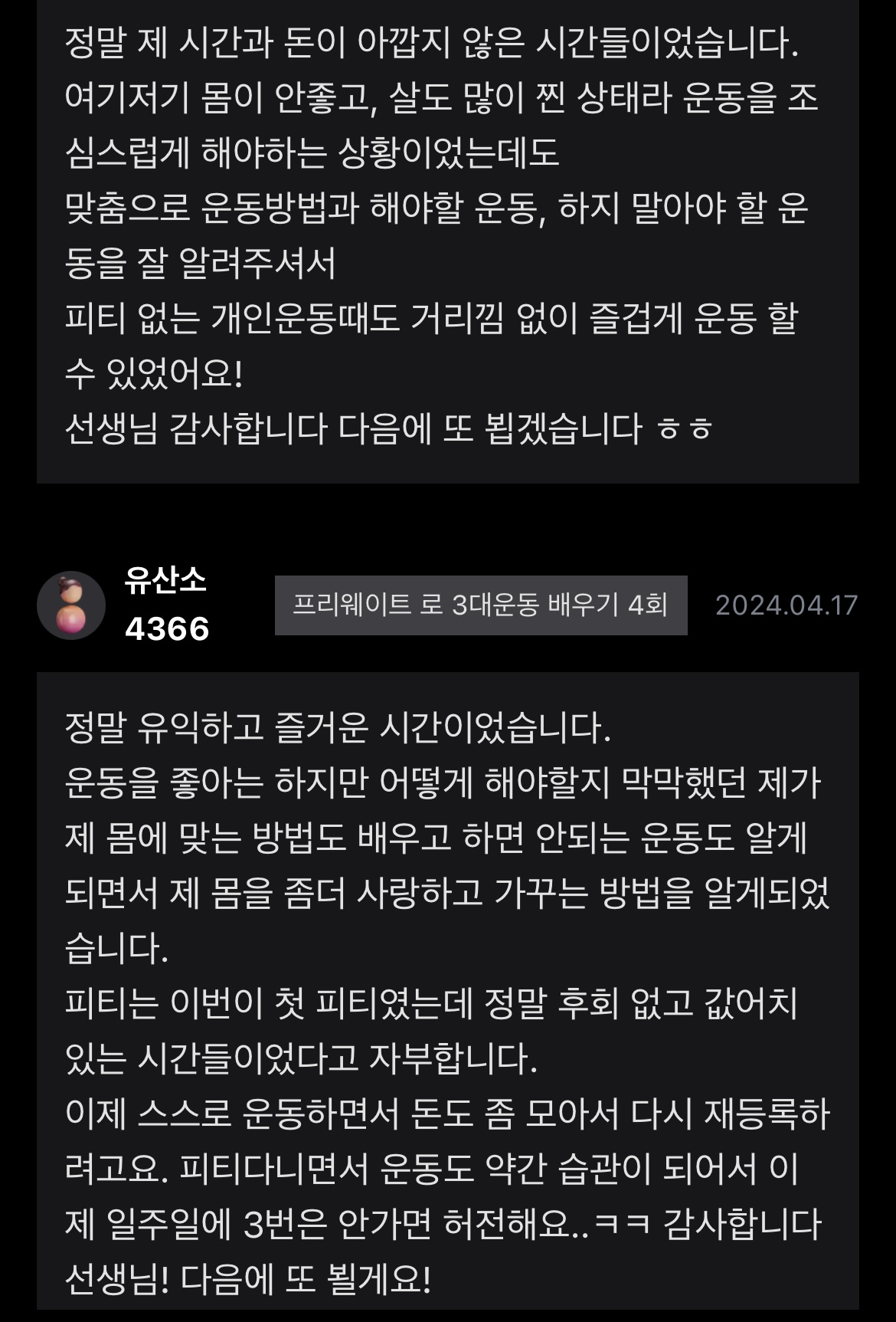 3️⃣재등록 회원 특별 서비스 제공 해드리고 피티후기 확인 가능합니다. (블로그 참조)